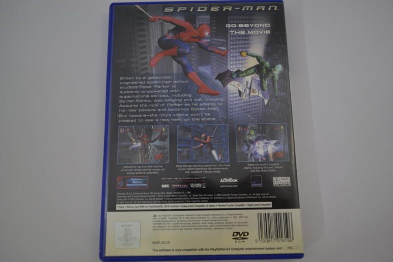 Spider-Man is een actie-avonturenspel uitgebracht voor de Playstation 2 in 2002 Ontwikkeld door Treyarch en uitgegeven door Activision is het gebaseerd op de gelijknamige film van Sam Raimi en laat spelers in de huid kruipen van Peter Parker in zijn strijd tegen misdaad in New York