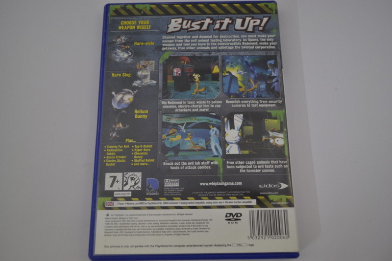 Whiplash is een actie-avonturengame uitgebracht voor de Playstation 2 in 2003 In dit humoristische en satirische avontuur probeer je als wezel Spanx en laboratoriumkonijn Redmond te ontsnappen uit een onderzoeksfaciliteit terwijl je zoveel mogelijk chaos veroorzaakt