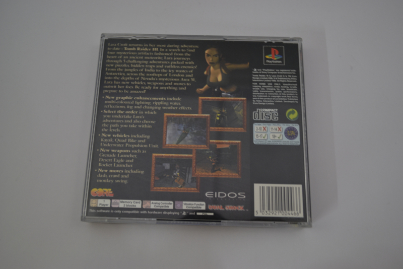 Tomb Raider III: Adventures of Lara Croft voor de PlayStation 1 is het derde deel in de iconische reeks rond archeologe Lara Croft. In dit avontuur reist Lara de wereld over, van jungle en woestijn tot Londen en Antarctica, op zoek naar mysterieuze artefacten met buitenaardse krachten. Het verhaal is minder lineair dan in eerdere delen en geeft spelers meer vrijheid in de volgorde van levels.