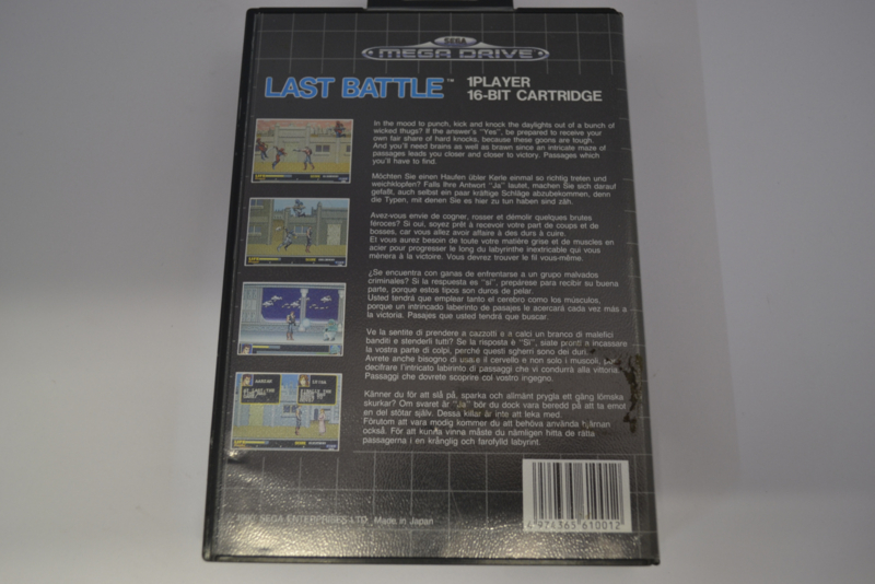 Last Battle voor de SEGA Mega Drive is een side-scrolling actiegame die zich afspeelt in een post-apocalyptische wereld. Je speelt als de vechter Aarzak, die het opneemt tegen bendes en gevaarlijke vijanden om de wereld te redden.