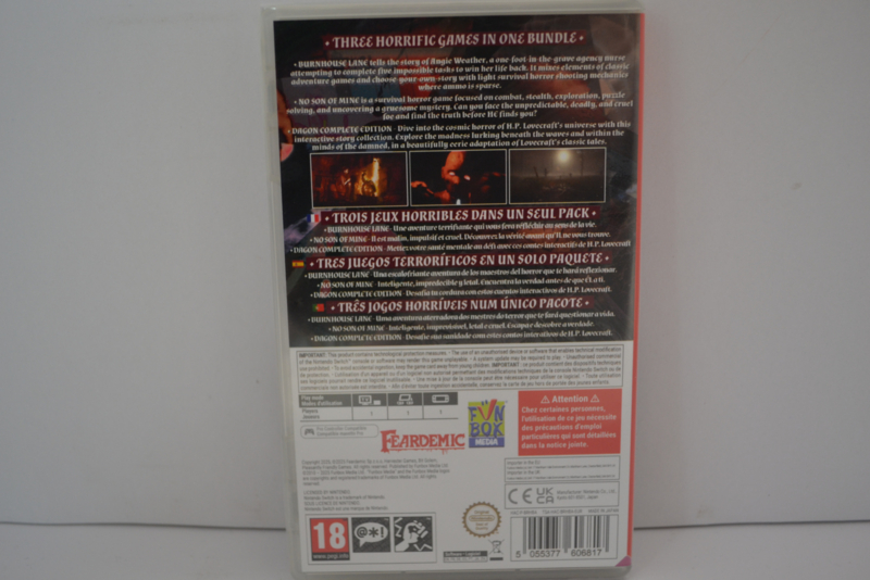 Feardemic Horror Bundle voor de Nintendo Switch is een fysieke verzameling van verschillende indie-horrorgames uitgegeven door Feardemic. De bundel brengt meerdere spannende en atmosferische titels samen die draaien om psychologische spanning, survival horror en mysterieuze verhalen.