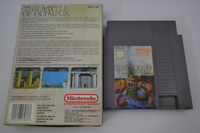 The Battle of Olympus voor de Nintendo Entertainment System (NES) is een actie-avonturenspel geïnspireerd door de Griekse mythologie. Je speelt als Orpheus, die op zoek gaat naar zijn ontvoerde geliefde Helene terwijl hij het opneemt tegen mythologische monsters en goden.